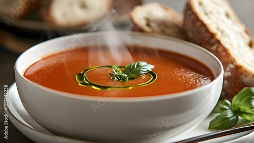 A bowl of steaming tomato soup garnished with basil and a drizzle of olive oil, accompanied by slices of bread. Concept Tomato Soup Delight, Basil Garnish, Olive Oil Drizzle, Comfort Food