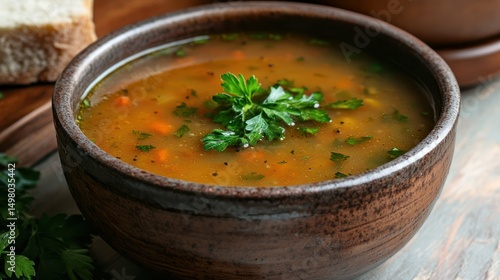 A bowl of steaming vegetable soup garnished with fresh parsley.