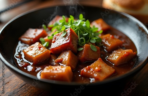 A bowl of tender braised pork belly in a rich soy based sauce served with steamed buns.