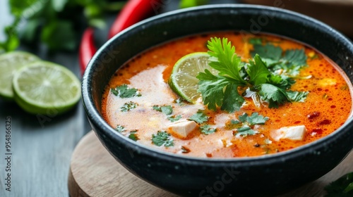 A bowl of tom yum soup garnished with fresh cilantro leaves and slices of lime, ready to be enjoyed as a spicy and comforting meal.