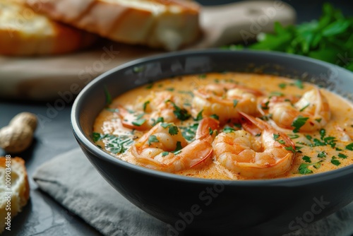 A bowl of vatap, a creamy dish made with bread, shrimp, coconut milk, and ground peanuts, garnished with cilantro