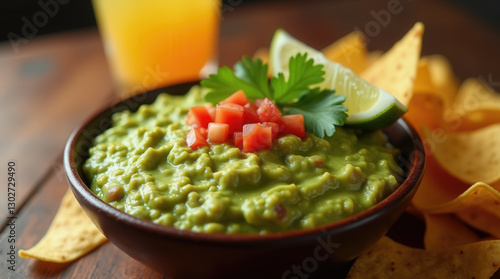 A bowl of vibrant guacamole topped with diced tomatoes and cilantro is accompanied by tortilla chips and a refreshing citrus beverage on a wooden table