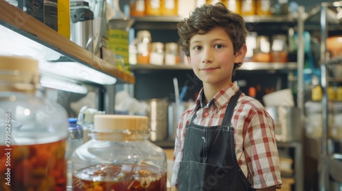 A boy wearing a Future Fermenter apron stands behind the stand ready to answer questions and teach about the fermentation process.