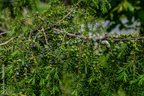 A branch of junpier with berries in different ripening stages