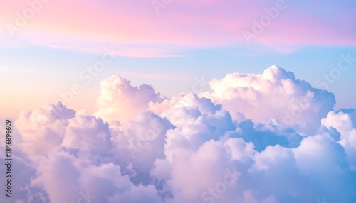A breathtaking aerial perspective of fluffy, billowy clouds bathed in the soft hues of a pastel sunrise, creating a serene atmosphere