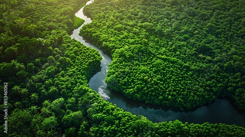 A breathtaking aerial view of a lush forest with a river winding through it