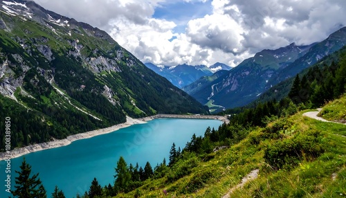 A breathtaking alpine landscape with a vibrant turquoise lake nestled among towering green mountains under a cloudy sky. A walking path winds along the bank