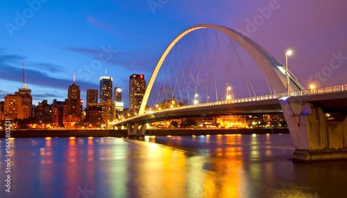 A breathtaking cityscape at night, illuminated by the lights of a modern arch bridge spanning a calm river.