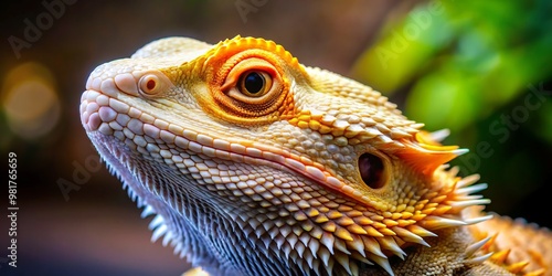 A breathtaking close-up of an albino bearded dragon highlights its distinctive hues and detailed textures, capturing