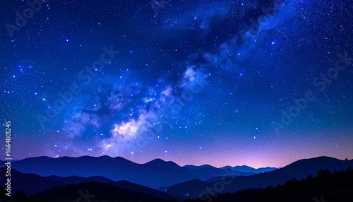 A breathtaking view of a night sky filled with countless stars and the vibrant Milky Way, stretching across a serene mountain range.