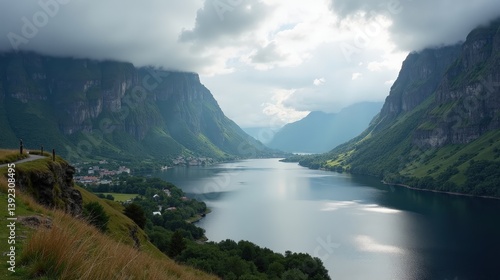 A breathtaking view of a Norwegian landscape at midday, featuring cloudy weather and captured from a panoramic angle.