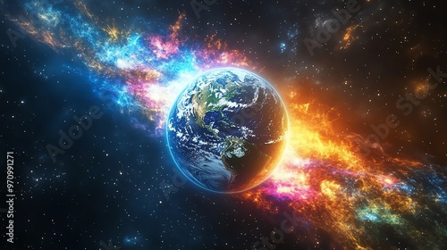 A breathtaking view of Earth surrounded by colorful cosmic elements, showcasing the beauty of our planet set against the universe.