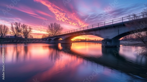 A bridge over a river during sunrise, painted with the soft