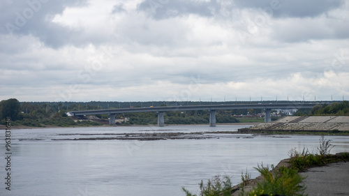 A bridge spans a river with a cloudy sky in the background