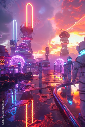 A bright light shines above the robots and sights. Carnival comes to life against the backdrop of a Martian sunset.