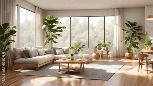 A bright, modern living room with plants, a sofa, and a dining area, promoting relaxation.