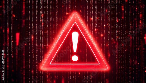 A bright red glowing warning sign with an exclamation mark inside a triangle, set against a backdrop of red digital code.