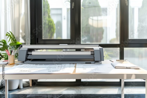 A bright, sunlit workspace with a large inkjet plotter printing architectural blueprints on a clean desk, exuding creativity and precision.