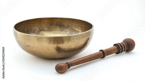 A bronze singing bowl and a wooden striker are shown