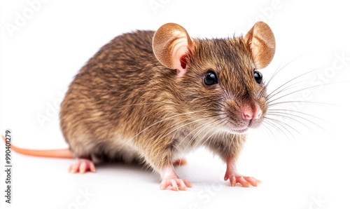A brown and white mouse is standing on a white background