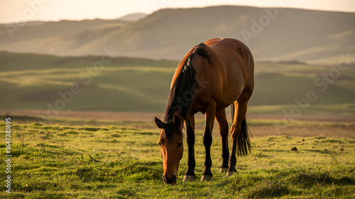 A brown horse grazing in a green field, with mountains in the background, soft diffused lighting.