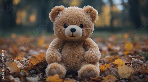 A brown teddy bear sits on a bed of autumn leaves.