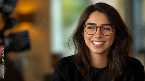 A brunette woman wearing glasses is smiling and happily engaged in an animated conversation in a warm, cozy indoor setting