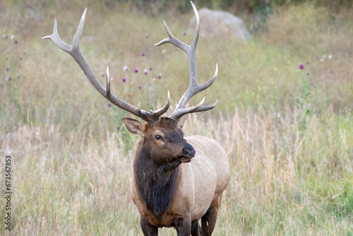 A bull elk stands in in a meadow and looks into the distance in Colorado.