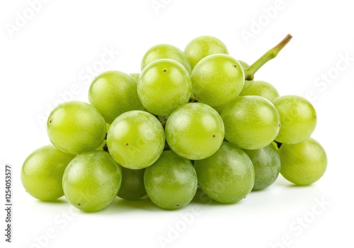 A bunch of fresh green grapes on the vine with a smooth glossy texture isolated on white background
