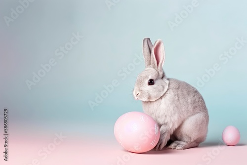 A bunny and an egg on a pink background. Generative AI