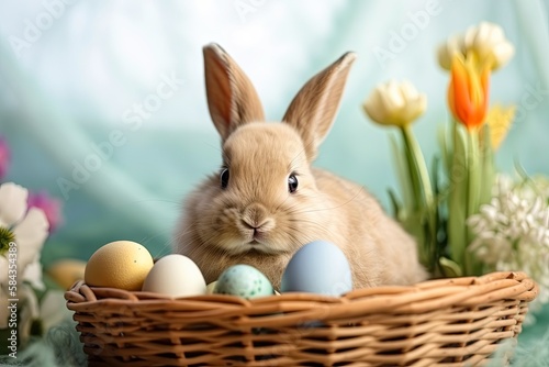 A bunny rabbit in an Easter basket with Easter eggs