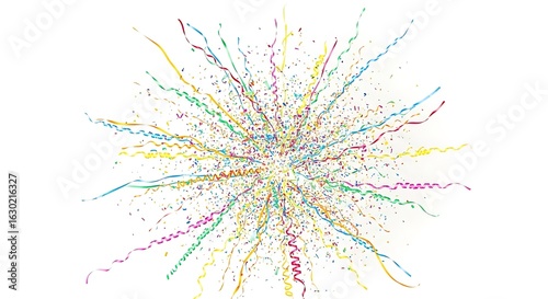 A burst of colorful confetti and streamers radiating outwards on a white background celebration scene