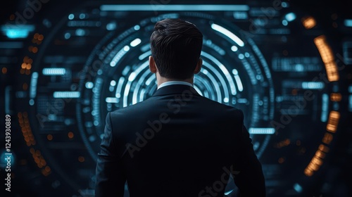 A businessman analyzing environmental risk assessments on a futuristic holographic dashboard