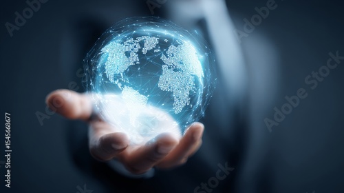 A businessman holds a glowing globe symbolizing global connectivity and innovation.