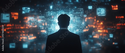 A businessman looking at a smartphone, with a holographic interface of metaverse, digital banking, and big data, surrounded by digital and financial technology icons