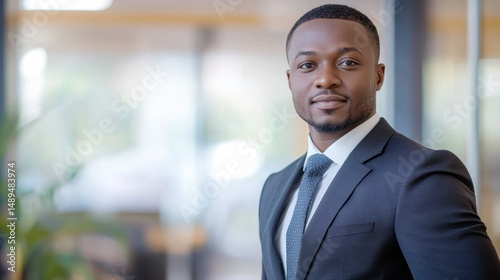A businessman posing for a business portrait with a blurred office background, exuding professionalism and success
