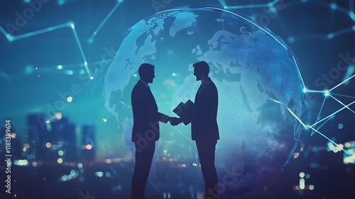 A businessman shaking hands with a silhouette of the world map behind him, in blue tones