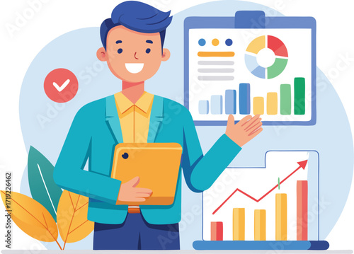 A businessman stands with a clipboard, looking at a chart on the wall, suggesting a meeting or analysis session.