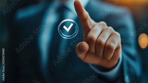 A businessman’s hand reaches out to check the correct option on a checklist, carefully ticking the box to indicate a selection, representing an important decision in the business choice process.