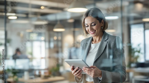 A businesswoman working on a tablet in a modern office, showcasing productivity and adaptability in the professional world