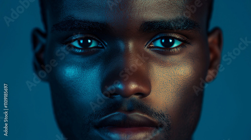 A captivating close-up portrait reveals the young black man's striking features illuminated by soft blue lighting, conveying a strong sense of identity and emotional depth.