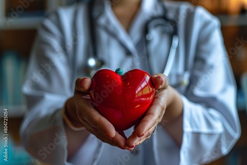 A caring doctor in a white coat with a stethoscope cradles a red heart model, symbolizing healthcare