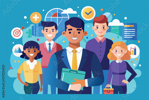 A cartoon illustration depicting a diverse team of professionals standing together and smiling. They are all wearing business attire and the leader is holding a clipboard.