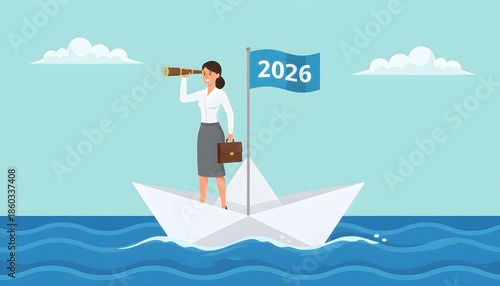 A cartoon vector illustration of a businessman surfing ocean waves on a travel concept ship near a summer beach island