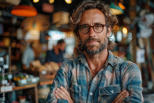 A casual, confident man wearing eyeglasses and a plaid shirt smiles at the camera