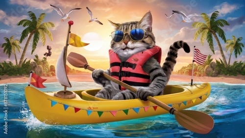 A cat in a life jacket and sunglasses on a yellow boat, AI