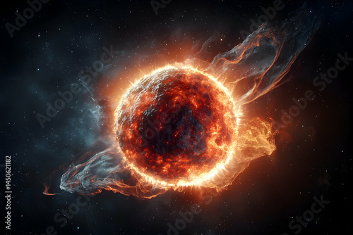 A celestial body blazes in the cosmos surrounded by fiery tendrils and a sparkling star field. Perfect for science fiction art or space themed projects