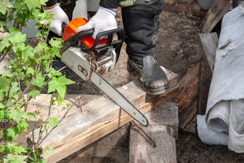 A chainsaw man is sawing boards in his yard. Working with a chainsaw in the yard, a close-up.