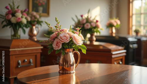 A charming arrangement of pink roses in a vintage vase, set against a warm indoor backdrop, perfect for celebrations or intimate gatherings.