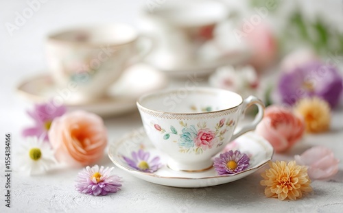 A charming arrangement of vibrant pink roses and yellow daisies adorns an elegant tea set, which is beautifully displayed on a white surface